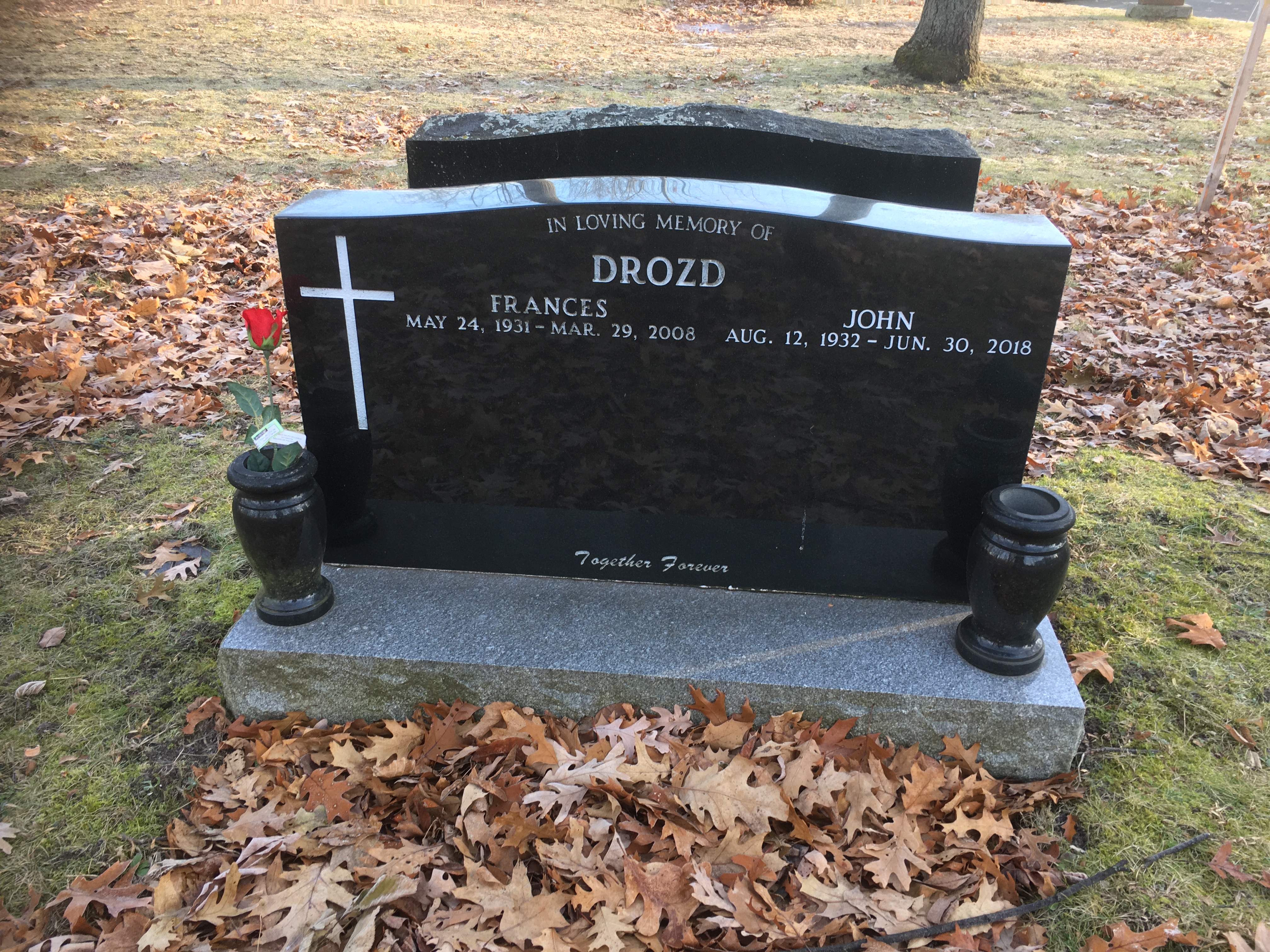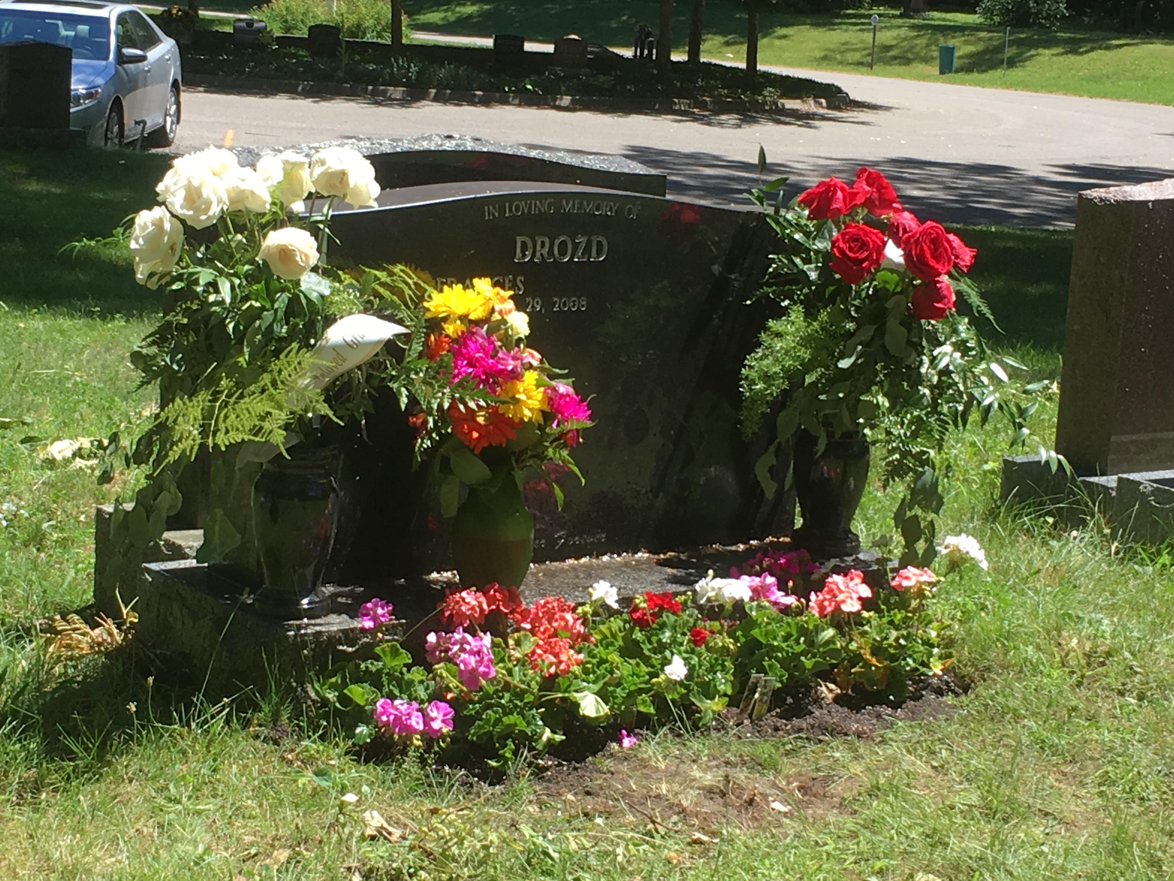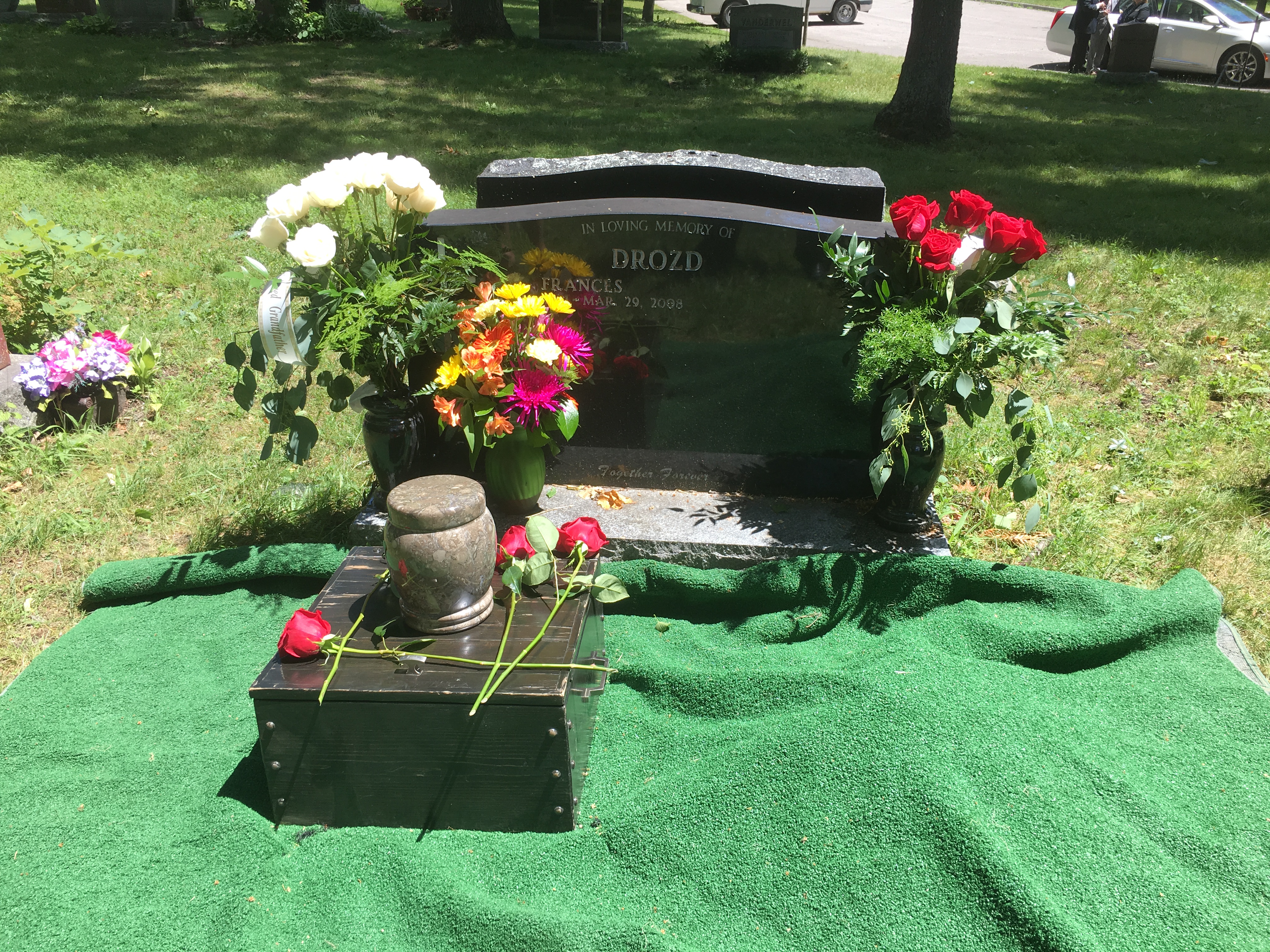 Holy Family Parish church on Sunday and sit on a sculptured stone bench at their gravesite at Oakland Cemetery in London and pray to them to tell them about my life. I like to put my mother's favourite red carnations in the vases at their tombstone. One day, as I was praying the Lord's Prayer at my parents' grave, I heard and saw a rustle of wind blowing wildly through the tall trees. The branches were waving to me; I know it was my parents' way ot telling me they were saying "Hi :-)" to me. I feel my parents are watching over me from heaven. We have "Together Forever" engraved in our tombstone, so my sisters and I can be buried in urns alongside my parents' urns.