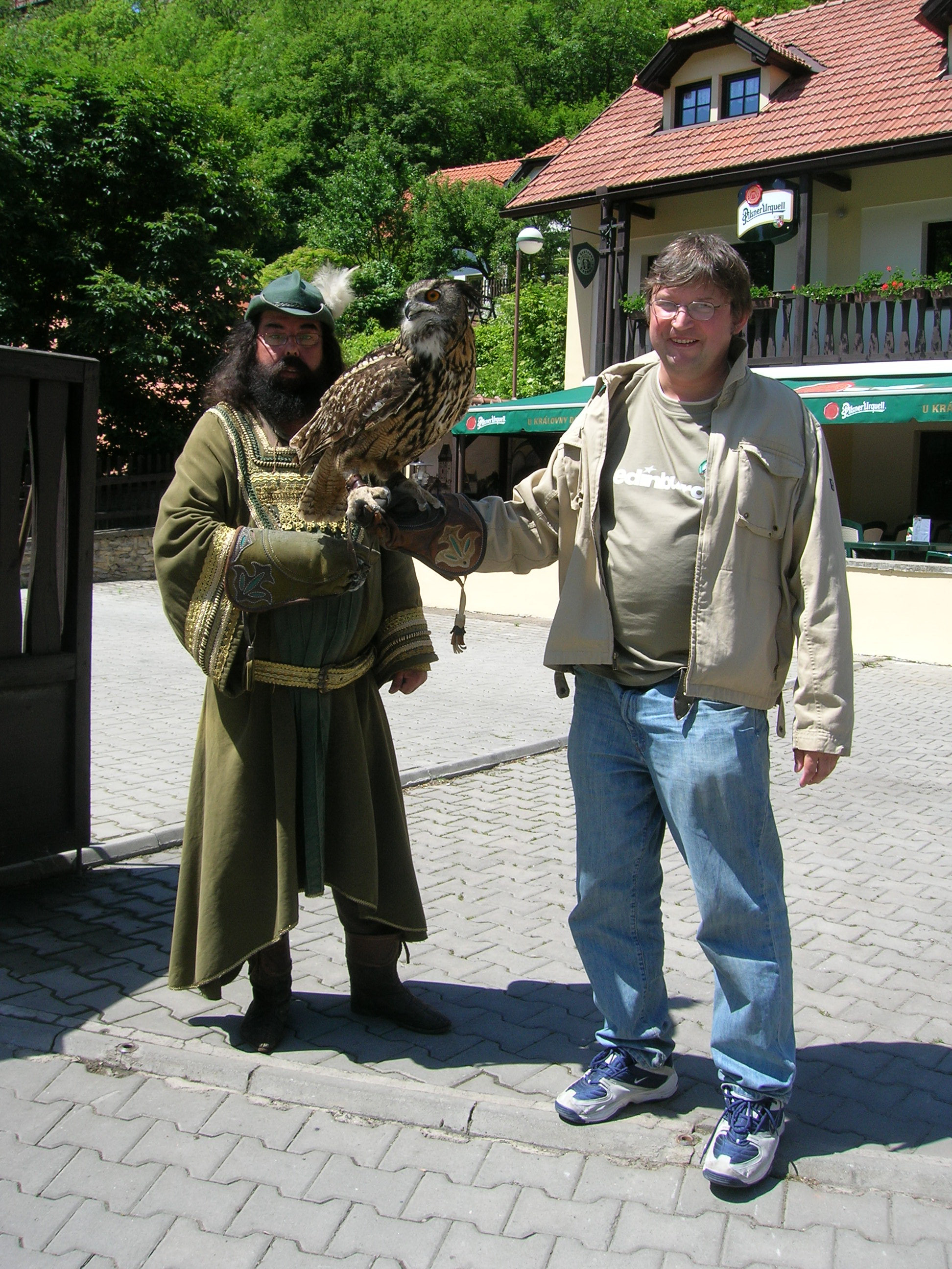 That's me with "Orza" perched on my arm, just outside Karlshtein Castle, Czech Republic.