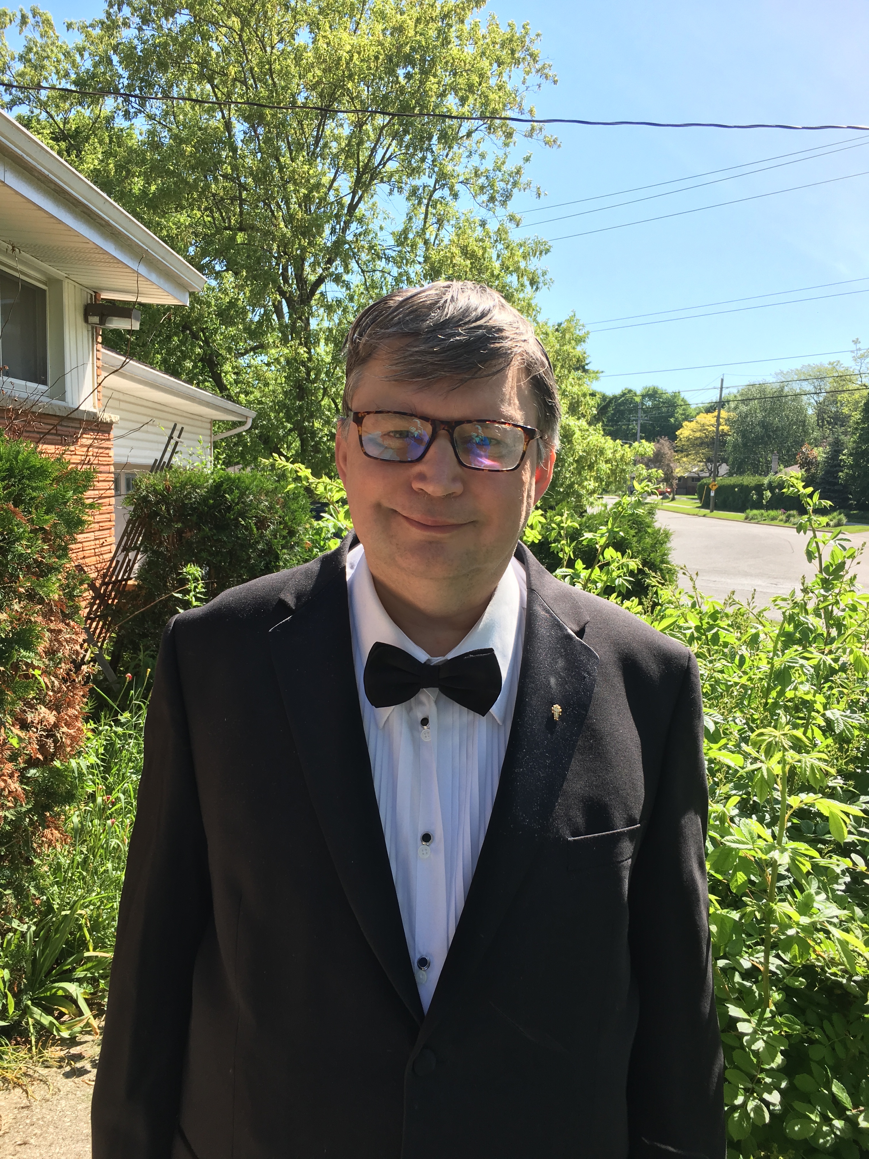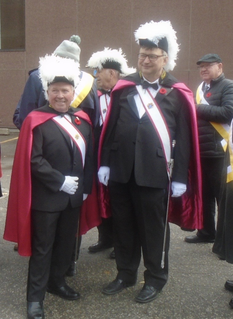 I have to buy the new regalia uniform. We still get to wear our Knights of Columbus sword. For now, I wear my black tuxedo when I am an Honour Guard. Here is a picture of me with my smile wearing my black tuxedo in front of my home in London.